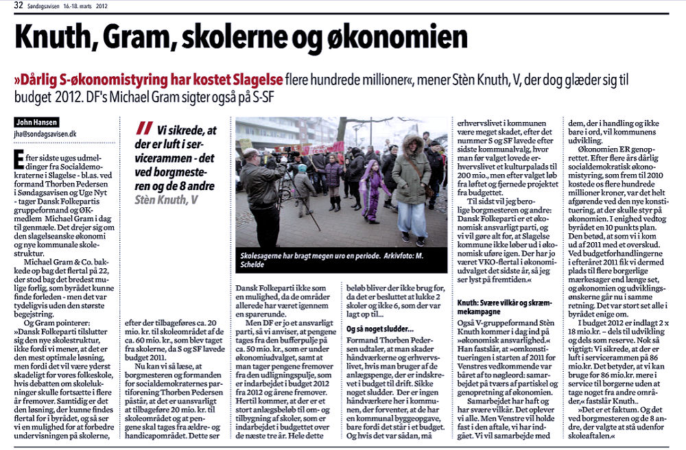 | 21. februar 2012 KOMMENTAR: Det er ikke godt. Stén Knuth kan ikke magte opgaven som udvalgsformand og få skabt et bredt flertal. Venstre ønsker tilsyneladende kun at hyppe egne kartofler - de skal ikke have lukket nogle skoler, hvor de har deres kernevælgere og det er især ude i "bondelandet". Det er et gennemgående træk i mange høringssvar, at man finder at Stillinge skole lige skulle holdes fri var venstremanipulation og at det uanstændige skolebyggeri i Hashøj (Slots Bjergby) skulle fremmes er en torn i øjet på mange. Socialdemokraterne er splittede og ved ikke lige rigtig hvad de vil. Enige er de ikke. Det at de vil bevare Nørrevangsskolen viser, hvor useriøse man er. Skolen har plads til 967 elever og der går i dag omkring 200 på den. Det ville have været en god idé at få spredt de to-sprogede og elever med en vanskelig socio-økonomisk baggrund ud blandt mere ressourcestærke børn. Socialistisk Folkeparti holder fast i det de hele tiden har sagt nemlig: Vi har alt for mange skoler til alt for få elever og da prognoserne viser at elevtallet falder og falder er vi nødt til lukke skoler. Vi ønskede at få bragt stort set alle skoler i spil og at alle skoler skulle behandles ens. Vi vil ikke være med til at nogen skoler skal fredes og andre skal slagtes. Vi vil tilgodese helheden og vort mål er at skabe de bedste muligheder for alle børn og ikke kun for nogle børn. Det er ikke populært, men det er at vise ansvarlighed. Deres holdning til ikke at ville lukke Nørrevangsskolen viser, at de dog har en skjult dagsorden. De mener ikke de skal genere deres kernevælgere i Nordbyen og har stor lyst til "at give venstre en på trynen". Vi tror i øvrigt ikke rigtigt på at de fire byrådsmedlemmer i SF er enige i denne sag, men de holder dog sammen ud ad. Dansk Folkeparti viser sin manglende seriøsitet ved ikke at ville bløde op på rygsækmodellen. Borgmesteren vil tilsyneladende ikke invitere Peter Lotinga med til mødet. Det er ikke klædeligt. Han var faktisk den eneste der har fået ret i denne sag. Han ville ikke have sagen i høring fordi han påstod, at man ikke kunne sende noget i høring som ikke havde udsigt til at have et politisk flertal bag sig. Selvfølgelig skal han med til mødet. Nu vil borgmester Lis Tribler forsøge sig som politisk kandestøber onsdag aften. Men som bekendt: "... et er søkort at forstå. Et andet skib at føre ...". Når den erfarne højrehånd Flemming Erichsen ikke kan finde et fælles fodslag med Stén Knuth kan hun næppe heller. Det ville også være klædeligt at se lidt på de tre socialdemokratiske udbryderes forslag. Det er faktisk slet ikke så ringe endda. Mandag den 27. februar skal "slaget slås". Vi tror på at løsningen bliver at Vestermose og Nørrevangsskolen bliver lukket og at en del skoler bliver "fødeskoler" samt at rygsækmodellen bliver blødt op med omkring 15 millioner kroner. Det kan man overleve politisk på til efter kommunevalget uden at miste vælgertilslutning. Men dermed er sagen ikke løst. "Det er som at tisse i bukserne, der varmer lige her og nu, men så bliver det rigtig klamt og koldt". Løsningen kan holde maksimum 2 til 3 år, så er man nødt til at lukke flere skoler og nogle har endog lukket sig selv. Vi har i øvrigt fået oplyst og verificeret, at eksempelvis Broskolen i Korsør giver lov til at elever fra Motalavej nord, der hører til Tårnborg skoledistrikt kan gå på skolen - herved reduceres elevtallet på Tårnborg skole og den integration man ønskede fremmet bliver sat over styr. Dette sidste kunne man sagtens have dæmmet op for fra både skoleforvaltningens og politikernes side. Webmaster