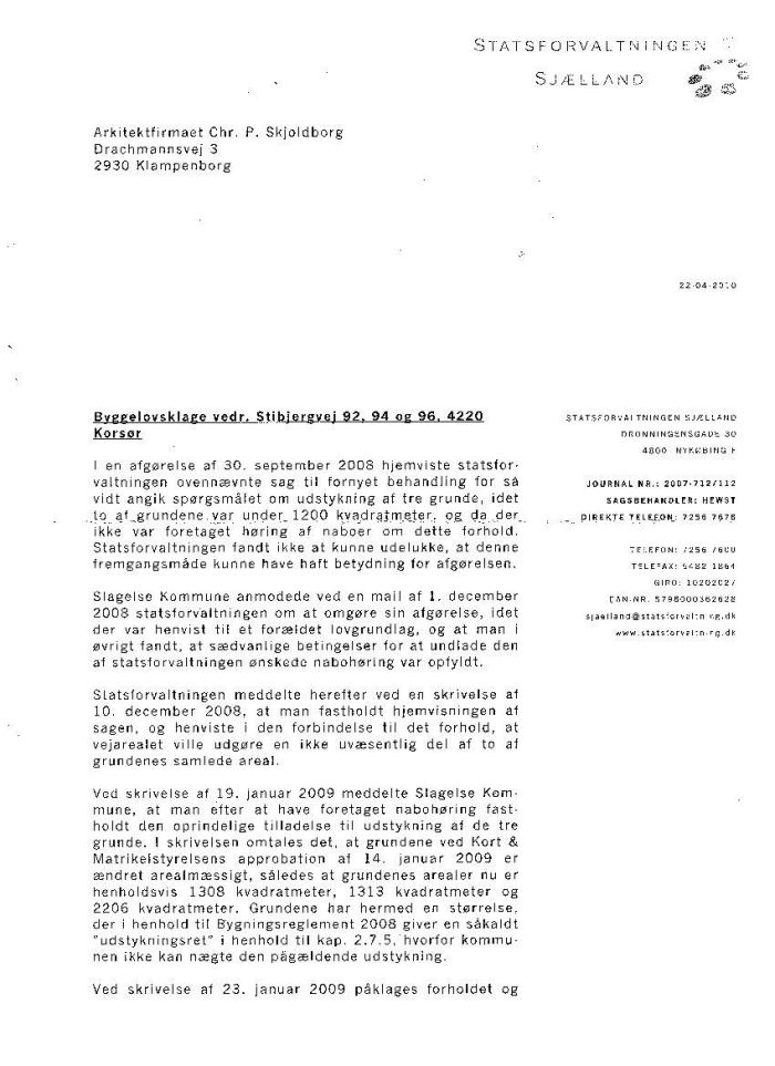 Vedr.:             KLAGE OVER AFGØRELSER TRUFFET AF SLAGELSE KOMMUNE OG STATSFORVALTNINGEN SJÆLLAND I FORBINDELSE MED UDSTYKNING OG OPFØRELSE AF 3 SOMMERHUSE, STIBJERGVEJ 92, 94 og 96, 4220 SLAGELSE KOMMUNE
