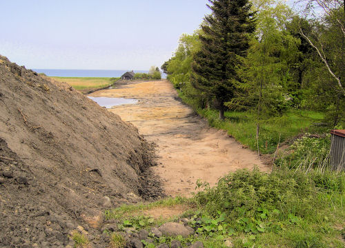 Ja, så er der kommet asfaltvej med betonkanter og brosten sat i beton., som ligger højere end asfalt belægningen. Der er så vidt jeg kan se ikke afløb fra vejen, men alt regnvand, som jo reelt bliver påvirket af asfaltoverfladen må ende med at løbe ind på vores grunde igennem fugerne mellem betonstene.