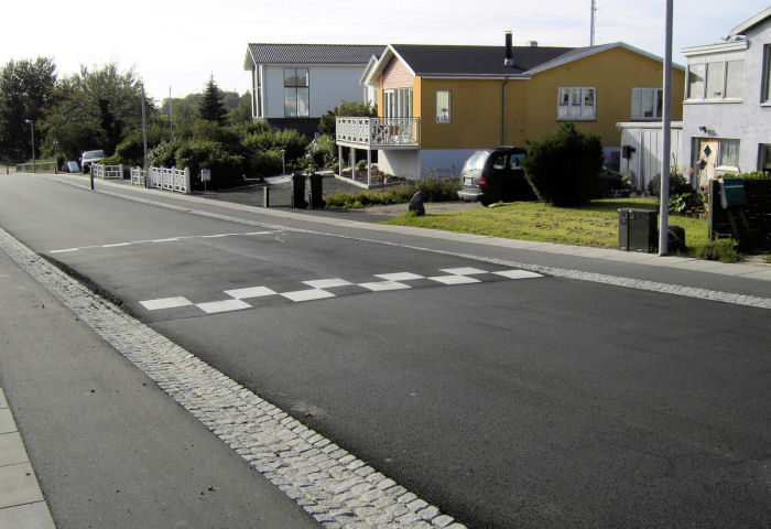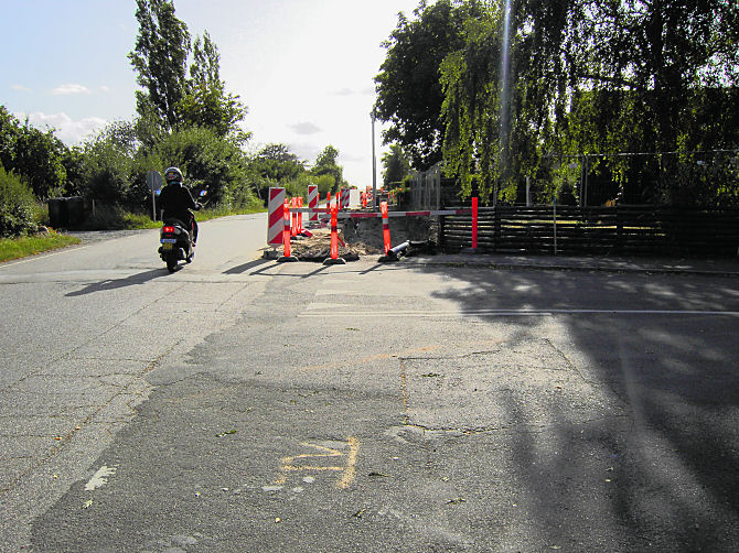 Det nye problem er den højre brostenskant på chikanen. Rammer et forhjul her går det galt. Det kan løses ved at skære kanterne skrå - sådan er det blevet rettet til i Vemmelev og andre steder.