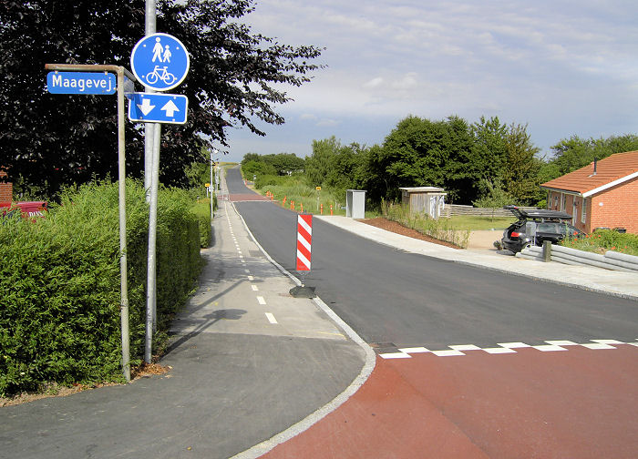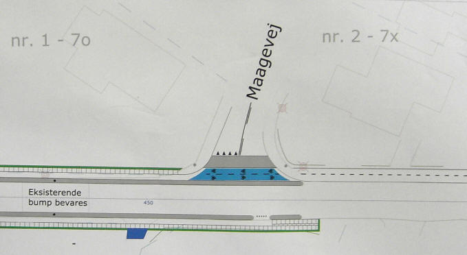 Bemærk at man ikke fører cykelsti og fortov længere frem i vandsiden end til Maagevej. Vi bedømmer det som et trafikalt færdelssikkerhedsmæssigt problem, at cyklister skal krydse vejbanen her.