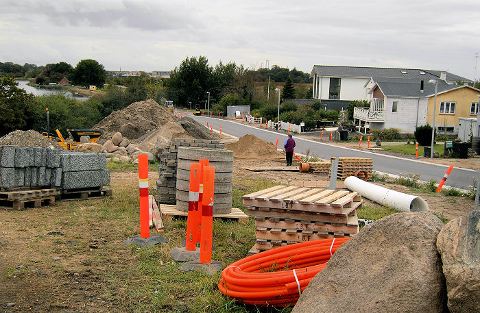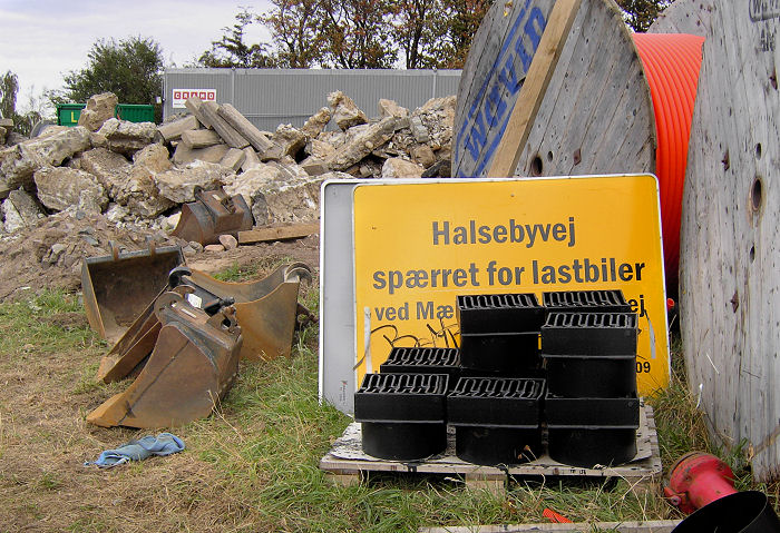 Man bruger parkeringspladsen til at henstille alt muligt grej og materialer. Vi håber det kan ligge i fred, men nu er der vel ikke lige nogen, der skal bygge en vej i baghaven. Det ligner en losseplads, men det skal nok blive en flot parkeringsplads. Hvor skal man ellers holde på Halsebyvej? Der er brugt en bunke materialer i forbindelse ny rør- og kabellægning. Vi gik rundt og tittede på det alt sammen, så får man en smule indsigt i, hvad der skal til for at lave en sådan vejrenovering.