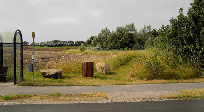 Vi er ved krydset Mælkevej Halsebyvej - vi ser mod vest. Stien der fører dig til Teglværksgrunden og Noret og videre helt til Tårnborg banke ligger lige før busstoppestedet, man kunne godt have et skilt der viste, at der var en sti her. Her kan du plukke mirabeller og kirsebær.