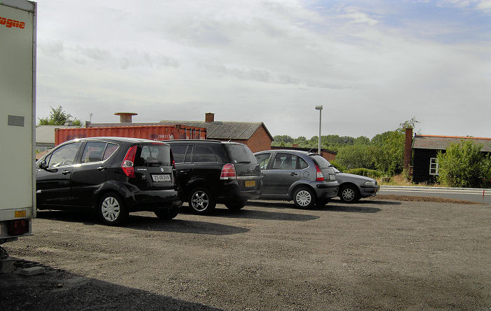 Parkeringspladsen er allerede taget i brug heroppe på bakken. Disse vogne tilhører dog gæster der skulle på besøg i den store lækre villa heroppe. Der er gode oversigtsforhold, når man skal ud fra pladsen.