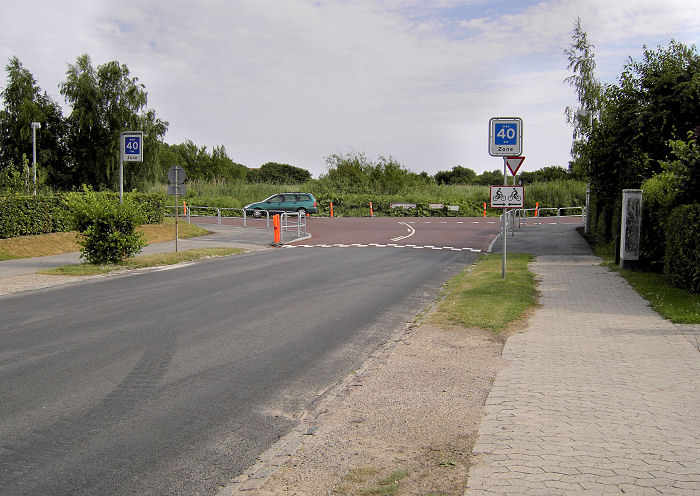 Der burde også være en fartbegrænsning her på 40 km/t. Ikke en stillezone, men røde påbudsskilte.