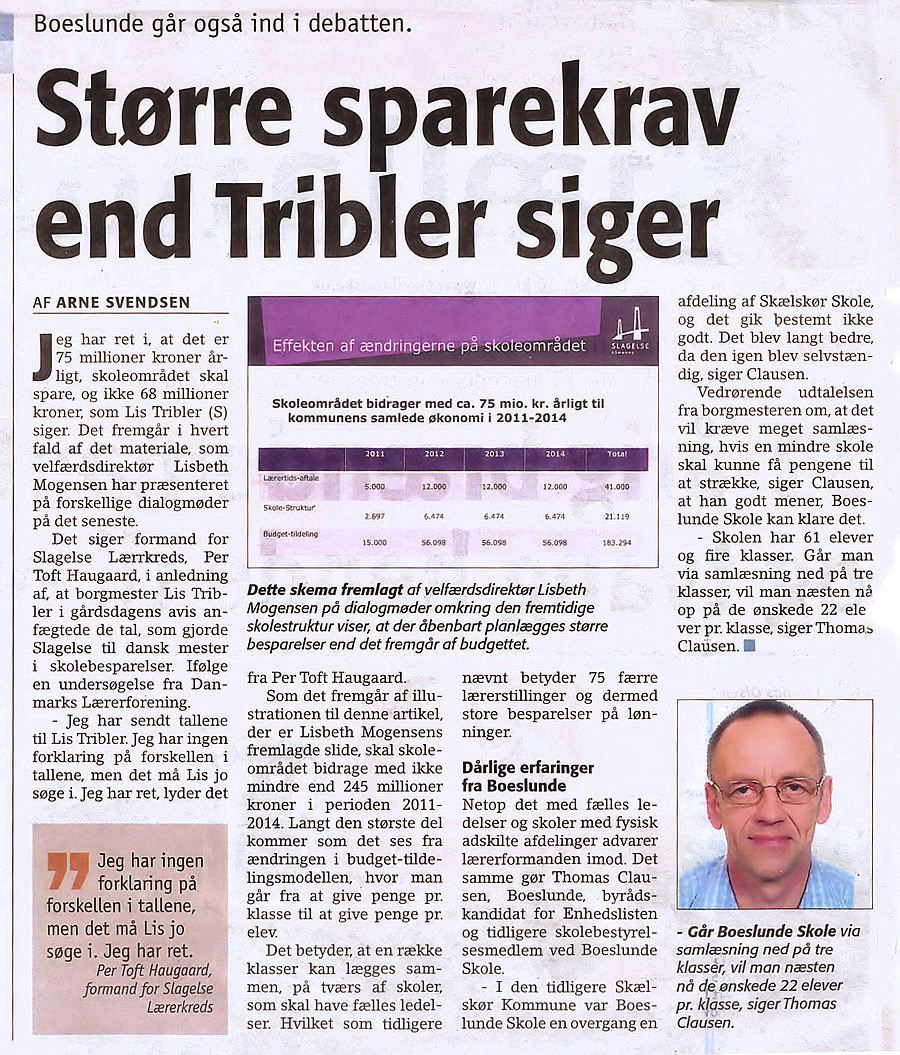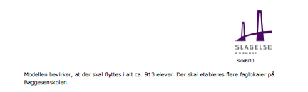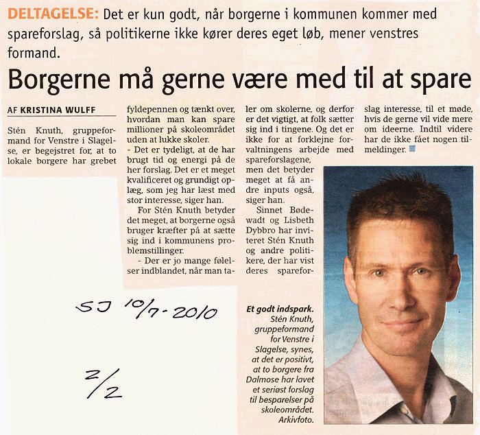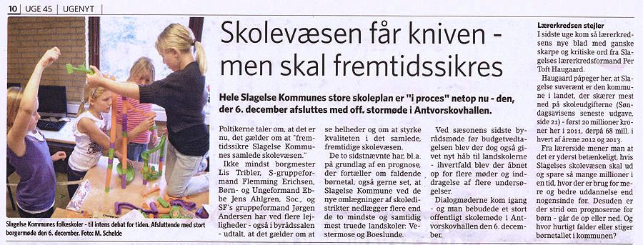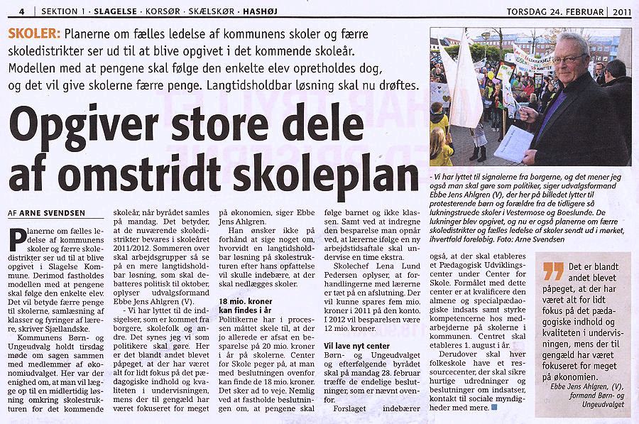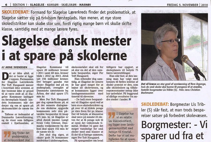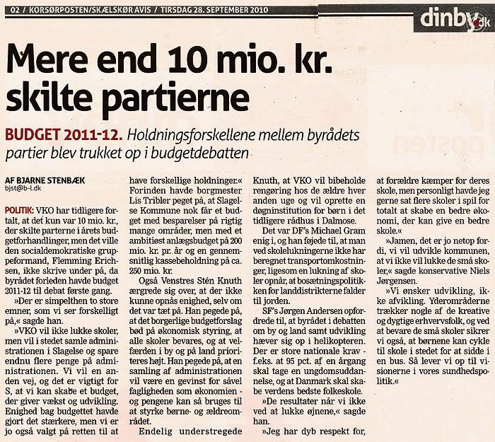 Socialdemokraterne og Socialistisk Folkeparti har indgået budgetforlig. Der forventes endeligt vedtaget ved 2. behandlingen mandag den 11. oktober 2010. (Det blev vedtaget, men der kom forskellige udmeldinger vedrørende skoleområdet. Nu starter der en høringsfase og først i december måned bliver noget endeligt afgjort om skolenedlæggelserne og skoledistrikternes fremtidige udseende. webmaster den 12.10.2010) Løsningsmodellen for besparelserne på skoleområdet tager udgangspunkt i den analyse, der er blevet udarbejdet af CAPACENT - her vælger man en tilpasset model C. Man arbejder med lukning af 2 skoler, men det kan sagtens ende op med flere. Det indebærer følgende: 1) Pengene følger nu eleven og ikke klassen (uanset elevantal i klassen) - det betyder at elevantallet i klasserne skal op på 24 (28) elever. I modsat skal de manglende penge gives fra en råderumspulje. Man vil ikke acceptere, at de skoler der har klasser med et elevtal så lavt som 12 får de samme penge pr. klasse som en klasse med 24 elever. Det nuværende system er en økonomisk forfordeling af de skoler, der ikke kan holde en rimelig klassekvotient. 2) Man forventer at kunne forhandle sig tilrette med lærerne om, at de omlægger arbejdstiden således, at de underviser 1 time mere om ugen. Det indebærer, at der skal aftales en ny lærertidsaftale. Lærerne i Slagelse kommune underviser i snit 614,5 timer om året. Man har sammenlignet med 5 sammenlignelige kommuner - her underviser lærerne 641,9 timer. Her er et potentiale på 27,4 timer pr. lærer pr. år. Det er da tankevækkende, at lærerne kun anvender omkring en tredjedel af den årlige arbejdstid til undervisning og samvær med eleverne. 3) Man forventer af afskedige 75 lærere. Det kunne ske ved at lade de ældste lærere fratræde først. 4) Man ændrer skoledistrikterne og gør dem større og kommer ned på 12 skoledistrikter måske 11 eller helt ned på 10. Vi har i dag 19 skoledistrikter. Herved kan man samle eleverne fra de større distrikter i større klasseenheder.
