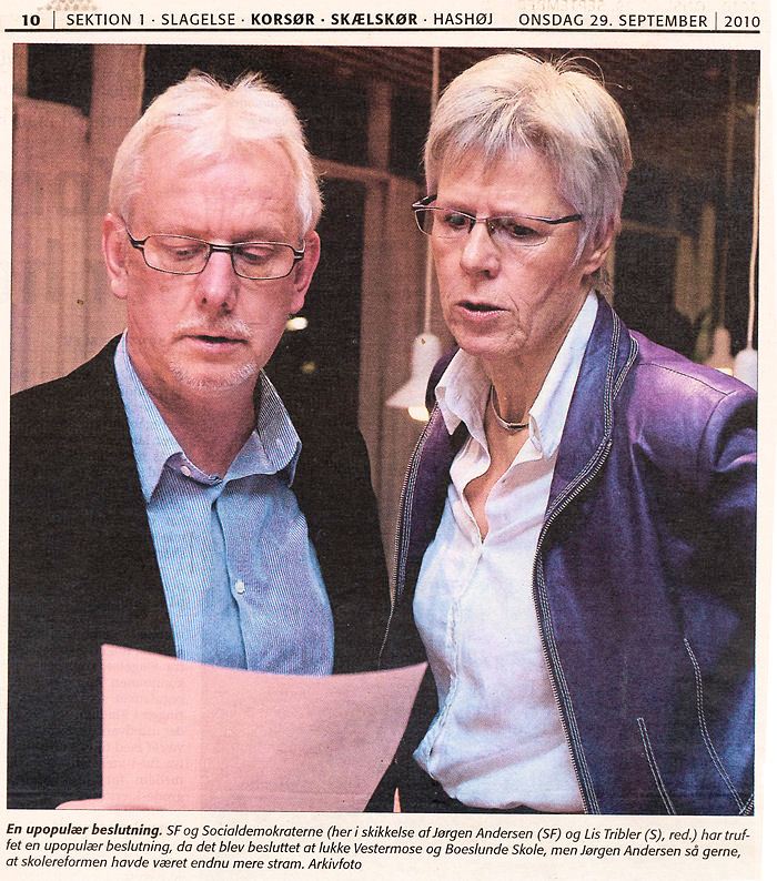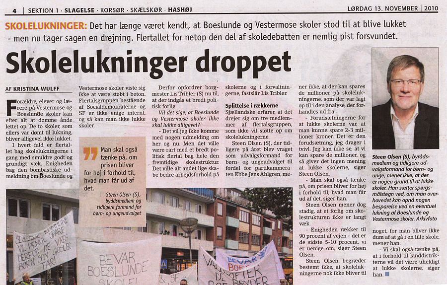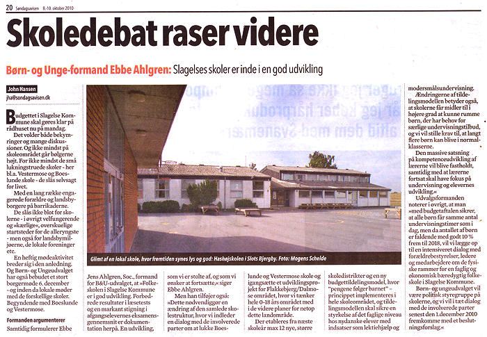 Skoleområdet"Folkeskolen i Slagelse Kommune er i god udvikling. Forbedrede resultater i læsetests og en markant stigning i afgangselevernes eksamensgennemsnit er dokumentation herpå. S og SF ønsker at fortsætte denne udvikling. Det nødvendiggør en ændring af den samlede skolestruktur. Derfor indledes nu en dialog med de involverede parter om at lukke Boeslunde Skole og Vestermose Skole og igangsætte et udviklingsprojekt for Flakkebjerg / Dalmose-området, hvor hele 0-18 års området indtænkes.