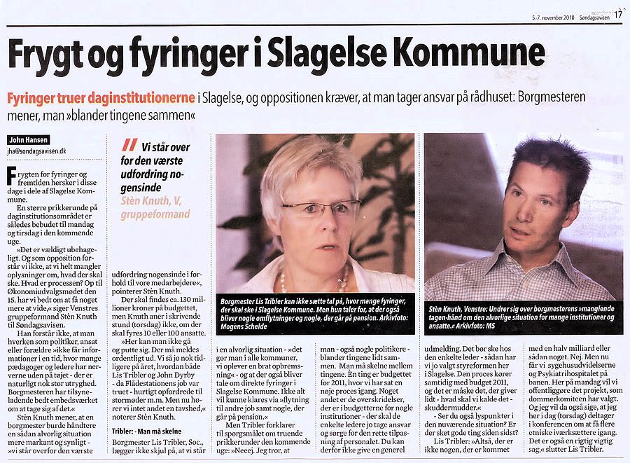Mandag den 11. oktober 2010 går det løs i Slagelse Byråd. Det er 2. behandlingen af budgettet det handler om. Ved 1. behandlingen var mødt et hav af forældre og børn op til byrådsmødet. Alle tilhørerne stod op langs væggene og en del politikere måtte tage børn på skødet. Det er kommet meldinger om store demonstrationer.