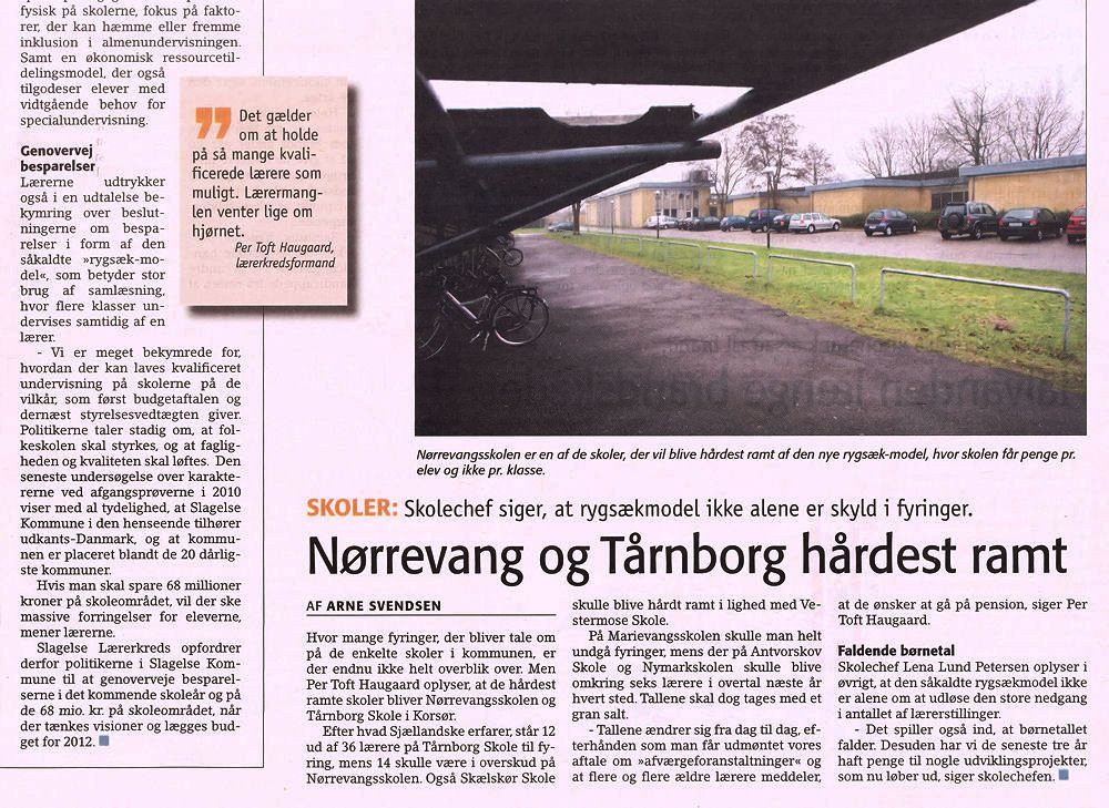 SLAGELSE LÆRERKREDS HAR LIGE AFHOLDT GENERALFORSAMLING VI BRINGER HER ET UDDRAG AF DEN SKRIFTLIGE BERETNING DET ER ET RESUME AF HELE DEN PROCES, DER HAR VÆRET OG STADIG ER I GANG DET ER BAGGRUNDEN FOR AT TÅRNBORG SKOLE VED DET NYE SKOLEÅRS START HAR 28% FÆRRE PENGE PÅ BUDGETTET OG SKAL NEDSKÆRE SIN LÆRERSTAB FRA 36 LÆRERE TIL 24 LÆRERE.