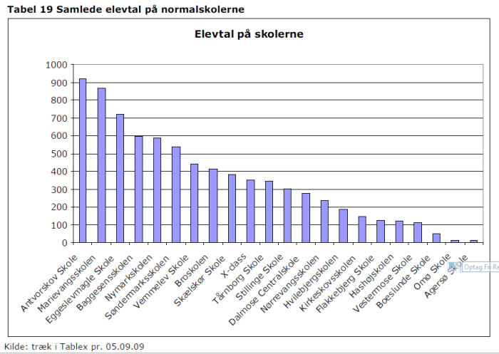 Hovedproblemstillingen er den, at elevtallet er stærkt faldende (der bliver færre og færre børn i den skolepligtige alder) og der er en betydelig overkapacitet på skolerne. Se blot på tallene her i tabellen nedenfor: