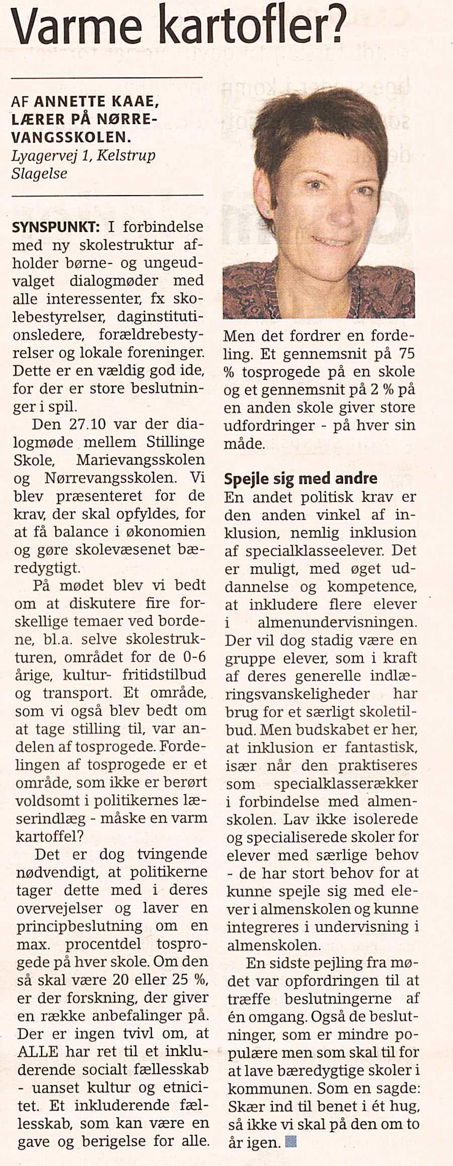 Det er ikke tilfældet med alle de foreslåede nye distrikter. Vi køber ikke politikernes præmis med, at der er skoler, der i Slagelse kommune har et to-sprogsproblem, der skal løses ved kunstige skoledistrikter.