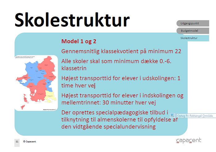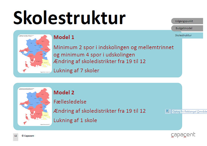 Fra konsulentfirmaet capacent er der kommet 2 skolestrukturmodeller som forslag. Det er bestemt en vanskelig situation. For os her i Tårnborg kan vi se at prognoserne viser, at elevantallet på Tårnborg skole vil falde med over 27%, når vi ser frem til år 2018. Det kan i øvrigt undre, at den problemstilling først rejses nu. Problemerne er jo ikke jo kommet "på en studs". Sidste år var kommunevalgår og der bringer man traditionen tro ikke den slags problemer frem i dagens lys.