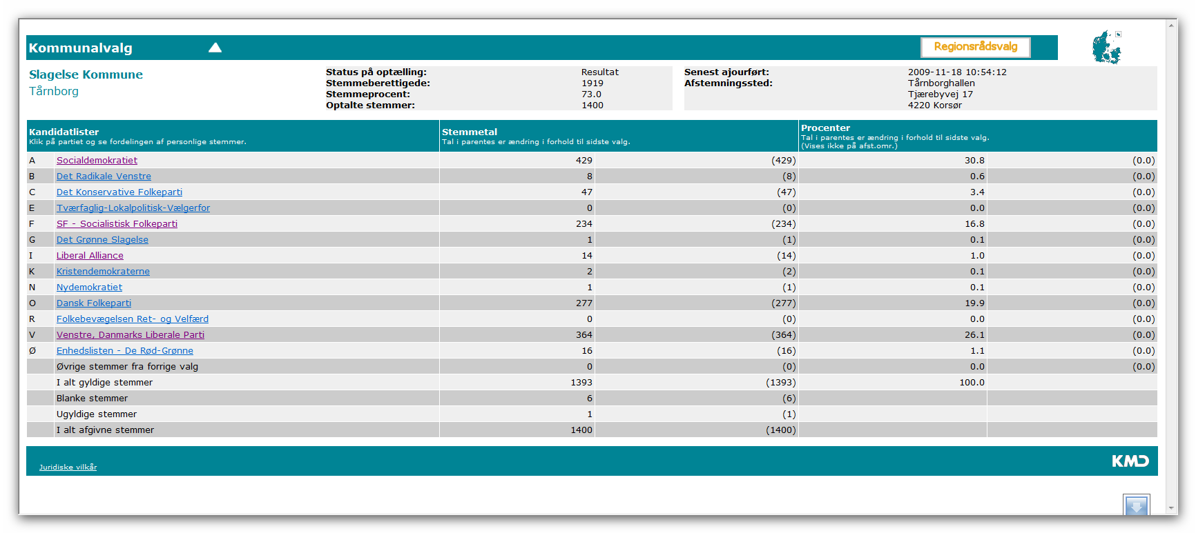 Ved at klikke her får du ovenstående tabel op i et nyt vindue - her er alle tal om sidste kommunevalg i NySlagelse kommune. Her kan du se stemmeafgivningen på de enkelte valgsteder og antallet af personlige stemmer og bevægelser i forhold til foregående kommunevalg. Valget i 2005 var dog atypisk.